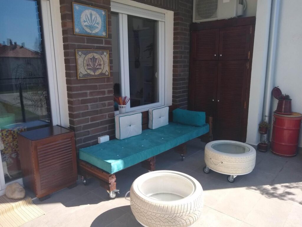 „Napravila sam plakar, otoman, stočiće, lampu i to mahom od starih stvari i dušeka, automobilskih guma. Sada je to potpuno druga terasa, ali ima još dosta posla. Na njoj provodim dosta vremena, pa želim da je prilagodim sebi i svom doživljaju za lepo. Radim pomalo svaki dan. Kada se umorim, stanem, kada mi se ne radi sačekam drugi, povoljniji trenutak. Bitno je ne raditi na silu i uživati u svakoj fazi. Tehničke detalje i rešenja nalazim najčešće na Pinterestu ili na majstorskim sajtovima i forumima.”